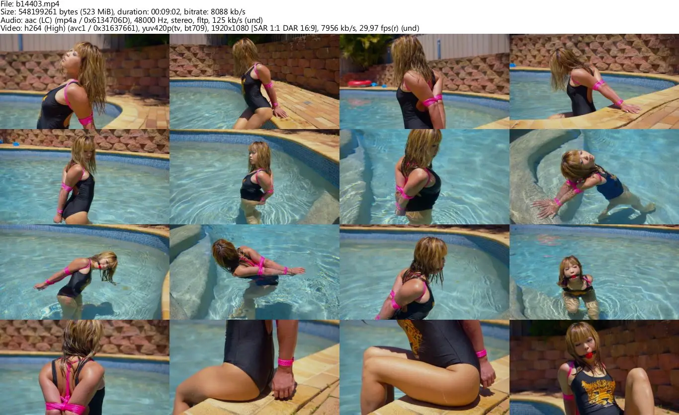 Mina spends a few minutes in the pool enjoying the nice day and warm water. She is wearing a tiger print one piece swimsuit and she has her elbows tightly bound. What a nice day this was, we will do many more shoots out here by our pool, we just thought we would test the waters so to speak so this one is rather simple. Some really beautiful shots here though, I just love the colour in this footage. Minas ass looks pretty hot with that wet swimsuit though. P.S. Please excuse the Aussie builders next door making a bit of a noise. One thing that is slightly annoying about our new house is our next door neighbor has decided it would be a cool idea to build a brand new house next to us, so makes the days rather noisy.