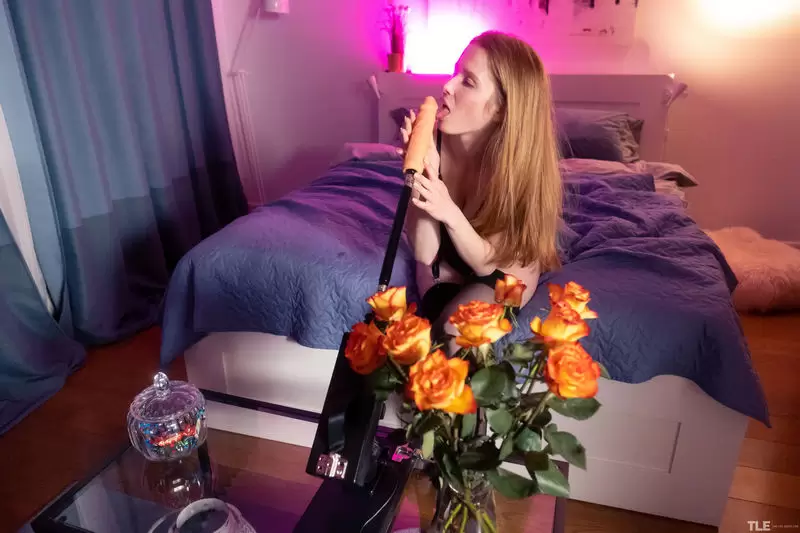 Sizzling-hot redhead Kendra U is insatiable, and now she has finally met her match. She has a date with the perfect sex machine – literally – to give her the hard, relentless pounding she has been craving. Dressed in a sheer, slinky black teddy, stockings, garters and heels, she enters her bedroom.